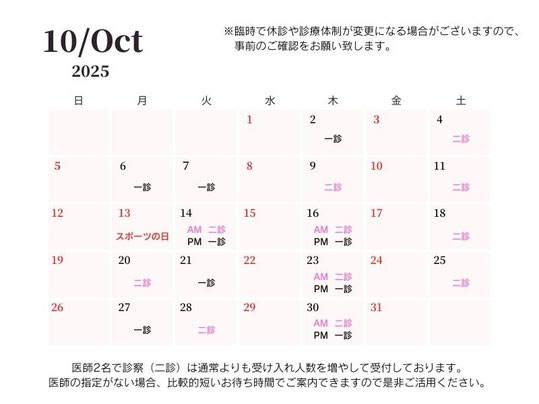 ◆◆医師2名体制(二診)での診療に関するお知らせ◆◆ 毎週月曜・木曜日の午前中、火曜日(不定期)、土曜日は医師2名での診療となります。 通常よりも受け入れ人数を増やして受付しております。 医師の指定がない場合、比較的短いお待ち時間でご案内ができますので是非ご活用ください。