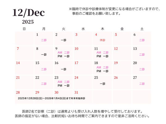 ※土曜日の9:00~10:00及び12:00~の時間帯は医師のご指定はいただけません。 (平日に関しましても診察状況によって医師の指定ができない場合がございます。予めご了承ください。) ※臨時で1名での診療体制へ変更になる場合がございますので、詳しい日程は下部のお知らせや診療カレンダーをご確認ください。 |