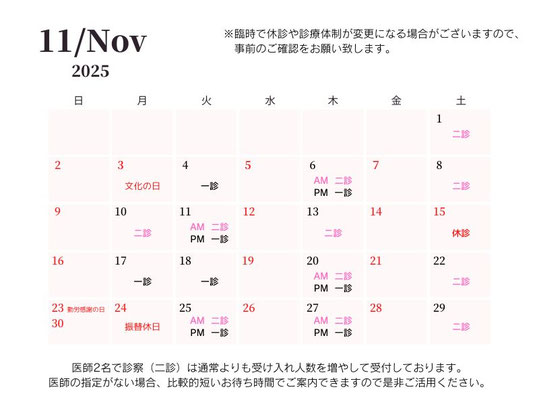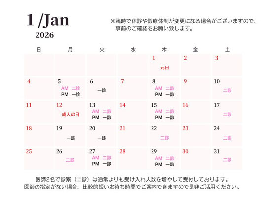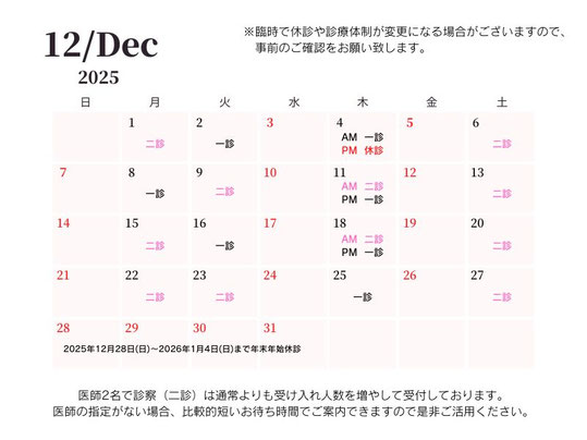 ◆◆医師2名体制(二診)での診療に関するお知らせ◆◆ 毎週月曜・木曜日の午前中、火曜日(不定期)、土曜日は医師2名での診療となります。 通常よりも受け入れ人数を増やして受付しております。 医師の指定がない場合、比較的短いお待ち時間でご案内ができますので是非ご活用ください。