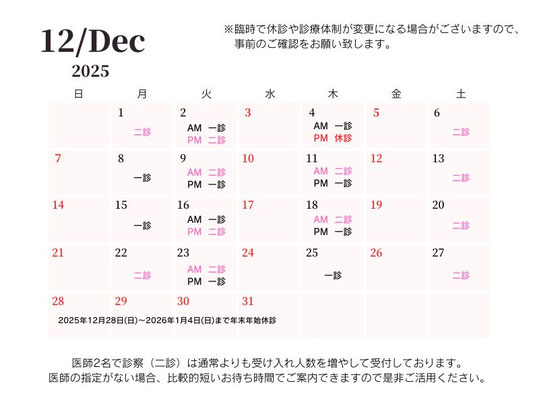 ◆◆年末年始休診のお知らせ◆◆ 2025年12月28日(日)~2026年1月4日(日)まで休診となります。 どうぞよろしくお願いいたします。 |